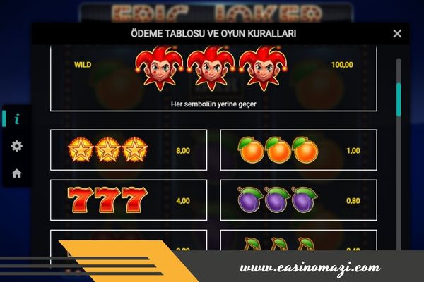 Epic Joker incelemesi ile sen de daha çok bahis yapabilirsin. Ki uzun süreli çevrimler yapıldığında, ideal miktarlarda ikramiye kazanmanı sağlar. Bahis katılımlarını artırmak için bonus tetiklemesi yapılabilir. 3 makaralı oyunda 3’lü dizilimler ile kazanabilirsin. Elbette bu 3 sembol Joker ise tam x500 oranında ikramiye elde edebilirsin.