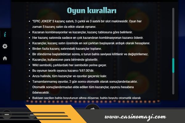 Epic Joker slot oyunu için RTP oranı %97 olarak uygulanmaktadır. Bu da teorik geri dönüş oranının ne kadar yüksek olduğunu göstermektedir.